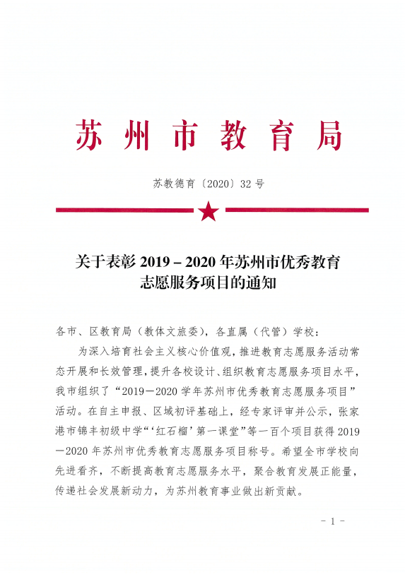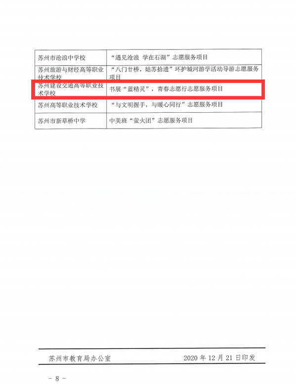 日前,在苏州市教育局“苏教德育〔2020〕32号关于表彰2019-2020年苏州市优秀教育志愿者服务项目的通知”中,我校的书展“蓝精灵”,青春志愿行志愿服务项目被评为“2019-2020学年苏州市优秀教育志愿服务项目”。