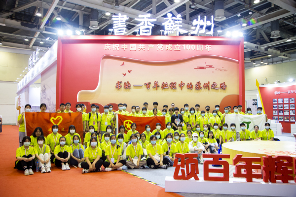 第十一届江苏书展于7月7日-11日在苏州国际博览中心举办。我校80名志愿者把志愿服务与党史学习教育紧密结合,如同一群闪烁的“萤火虫”,在红色的书海遨游,在书展的各个岗位上贡献青春力量。