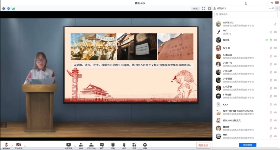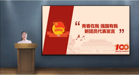 环艺系设计18401班的钱江悦同学以亲身实际案例告诉新团员们要认真学习团史、悟思想、开新局。“我们长在春风里,我们走在红旗下。我始终记得,当我佩戴起团徽,初次宣誓的时候,高呼那句‘为共产主义而奋斗’,何等自豪,何等骄傲。我相信各位新团员们也将会怀揣这份骄傲与自豪,开拓广阔篇章,实现远大理想!”
