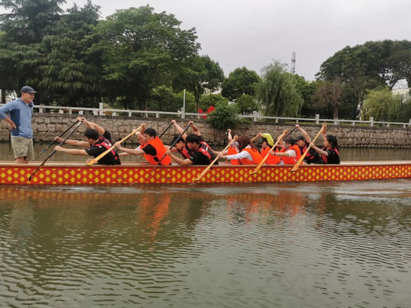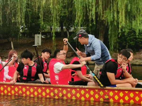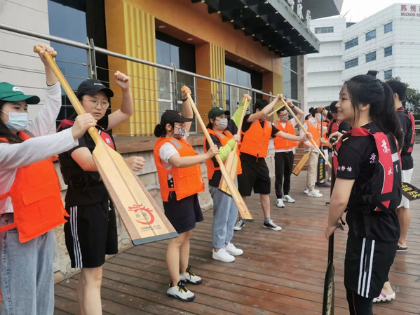 今天,我们的队员们化身为小小讲师,带领青年朋友们体验龙舟文化,传授龙舟技巧。随后在风景如画的苏州国际教育园景观河道进行了龙舟竞技,一起乘风破浪、奋楫争先,在相互交流中更好地传承“龙舟精神”,感受浓厚的传统文化氛围。