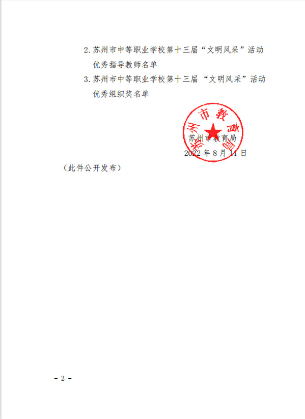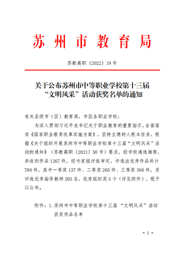 日前,我校在江苏省、苏州市第十三届中等职业学校“文明风采”活动中参加了职业生涯规划类、摄影类、才艺展示类、视频类等六个活动项目的比赛,荣获各类奖项39个,其中江苏省最佳作品奖3个,苏州市一等奖4个,苏州市二等奖9个,苏州市三等奖23个。